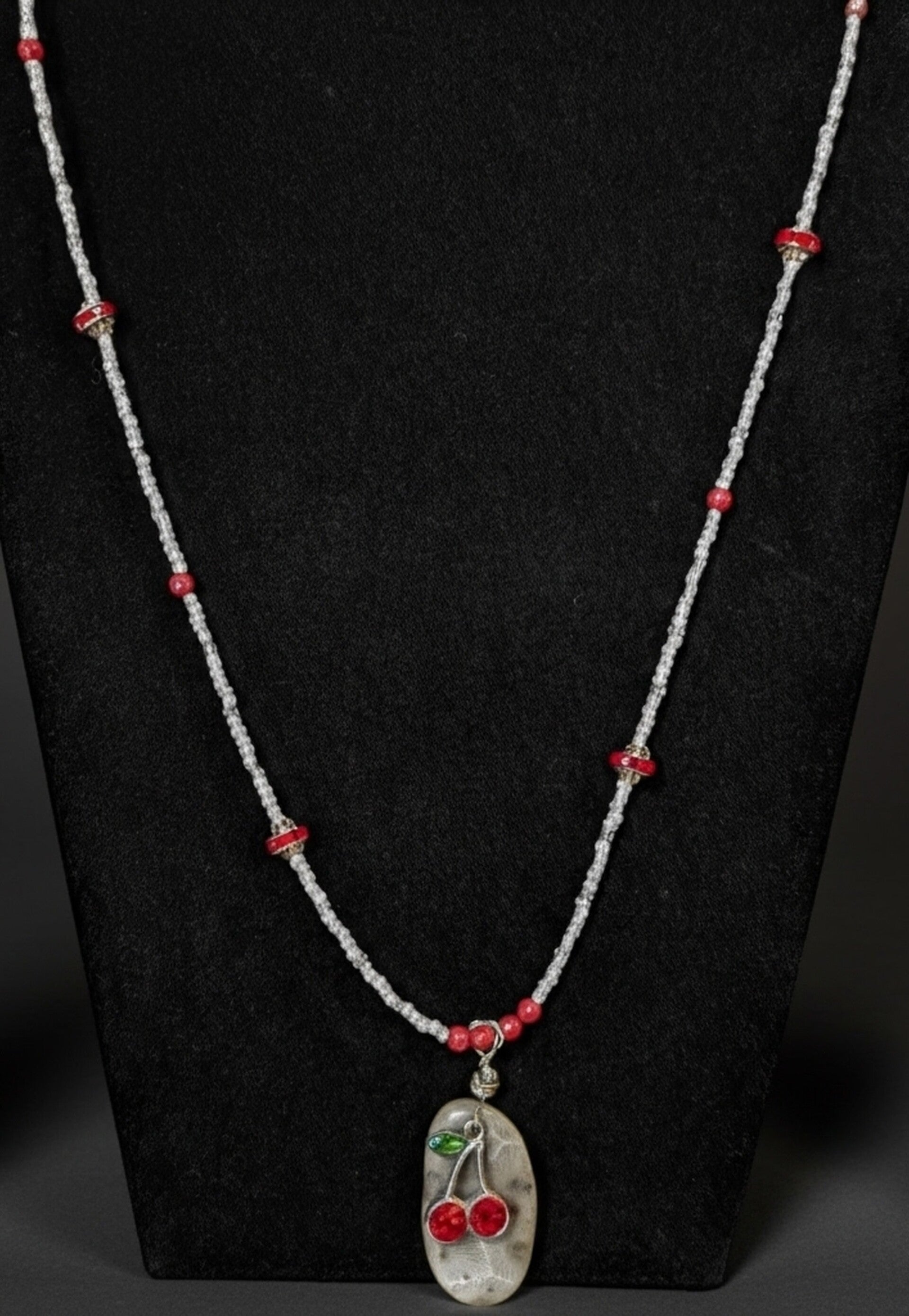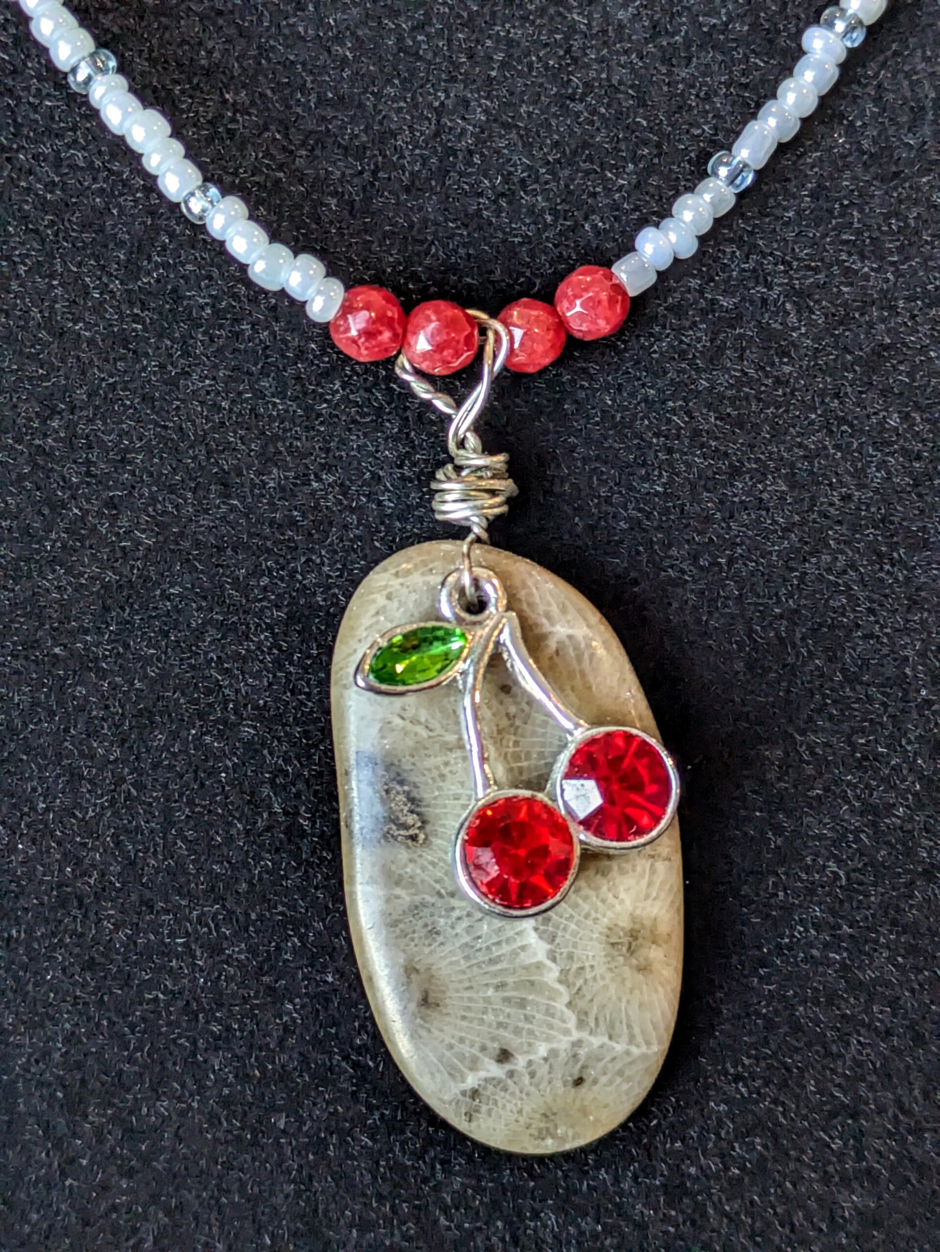 Lake Michigan Petoskey Stone Hand Beaded Necklace with Cherry Charm